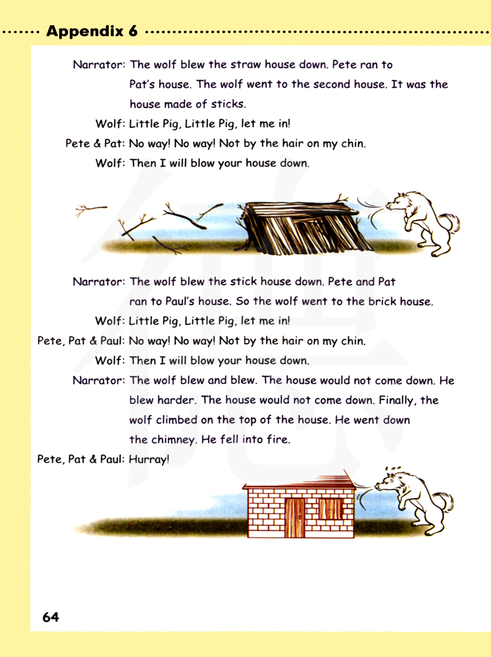 狼把稻草房子吹倒了,皮特跑到了帕特的房子。狼去了第二所房子。那是棍子房。小猪,小猪,让我进去!