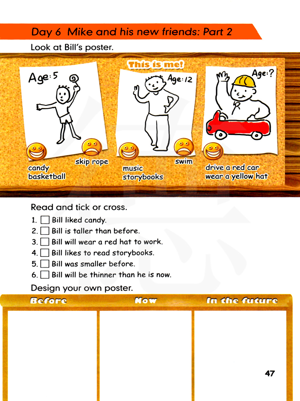 比尔将戴着一顶红色帽子去工作。比尔喜欢看故事书。