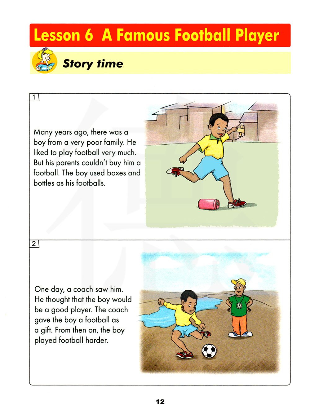 一天,一位教练看到了他,他认为那个小男孩会是一位优秀的球员。那位教练给了小男孩一个足球作为礼物,从那时开始,小男孩更努力的踢足球。