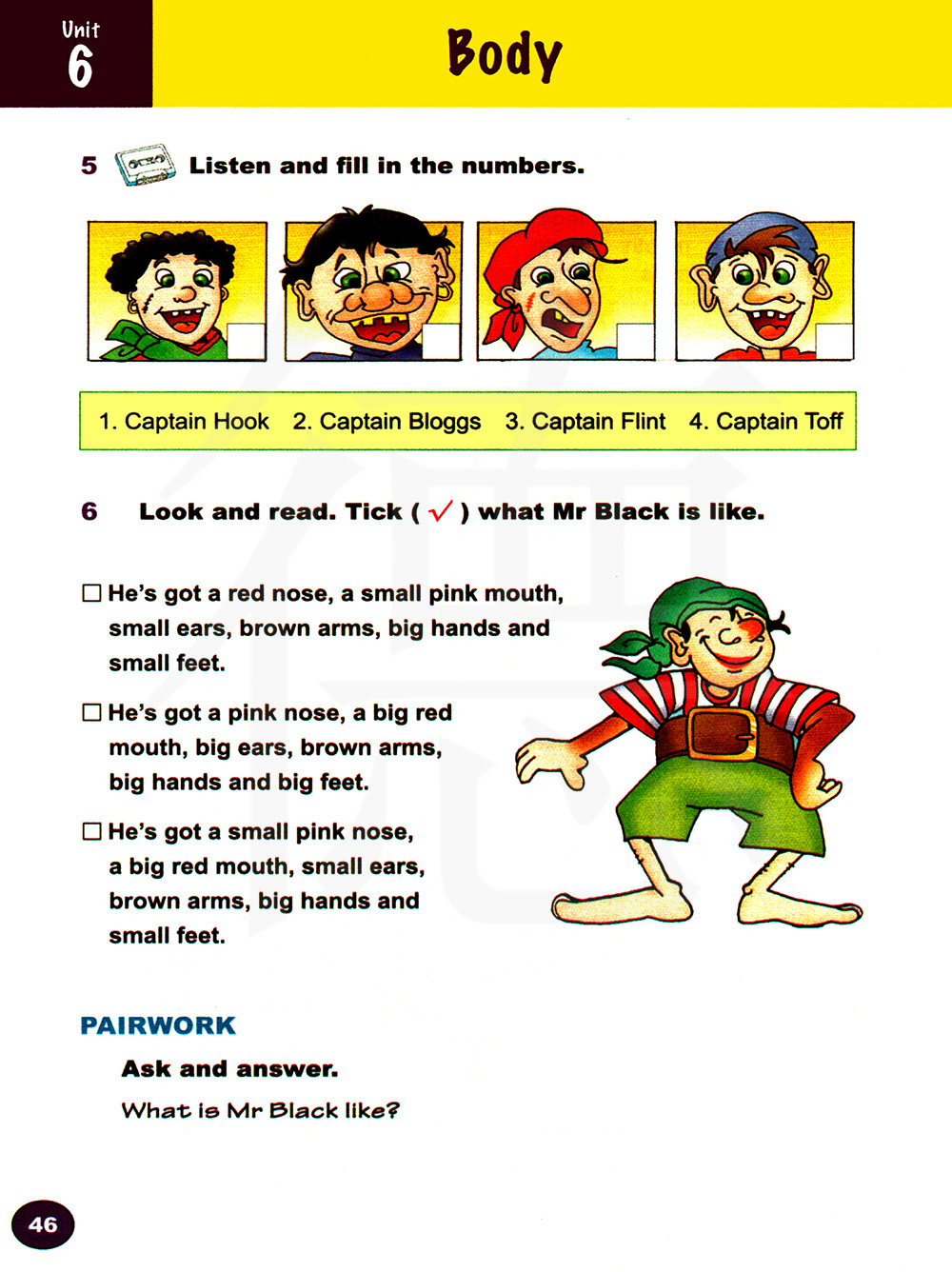他有一个粉红色的鼻子,一个红色的大嘴色,一对小耳朵,一双棕色的手臂,一双大手和一双小脚。