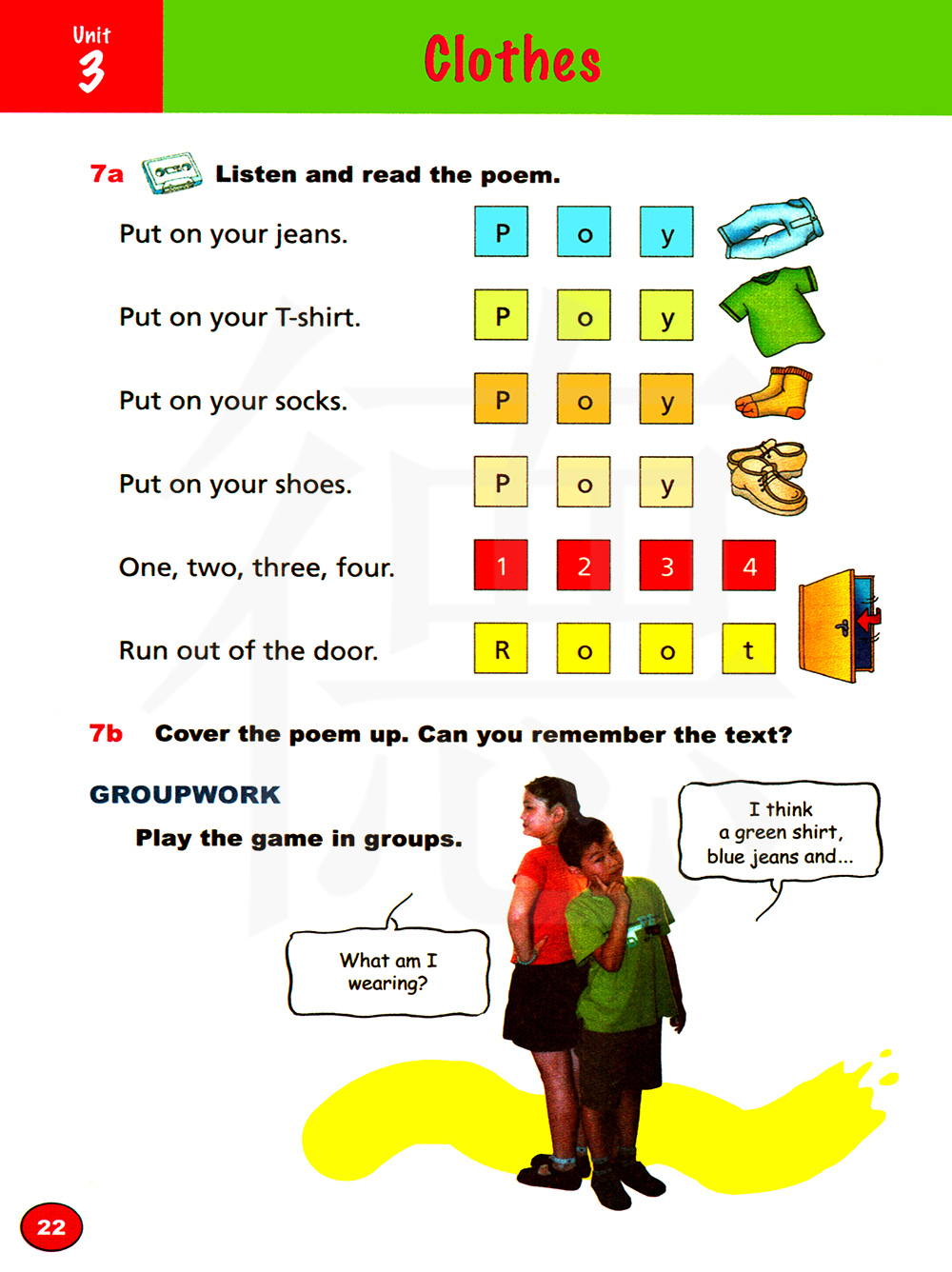 穿上你的牛仔裤。穿上你的T恤衫。穿上你的袜子。穿上你的鞋子。一、二、三、四。跑出门外。