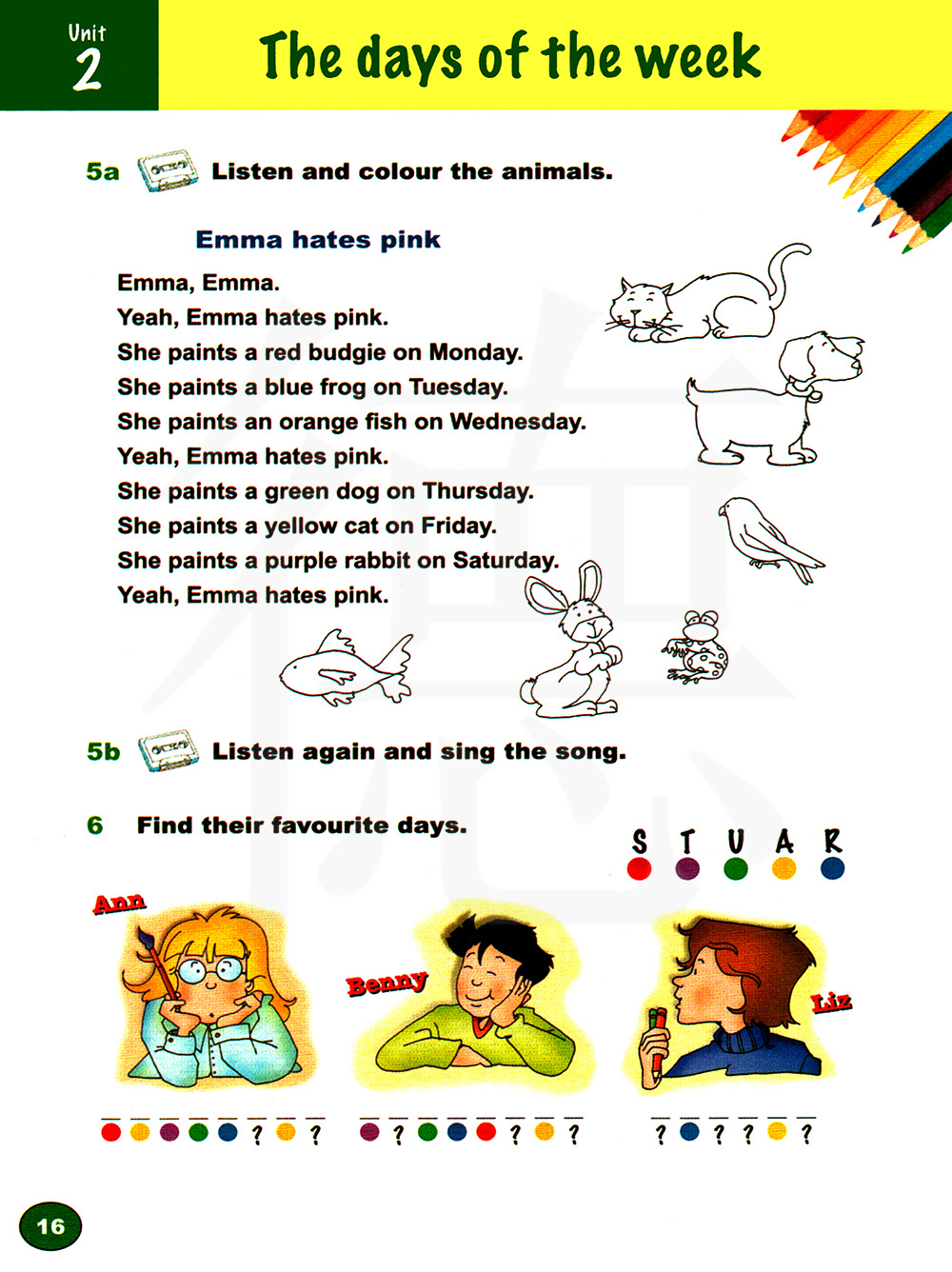 听一听并给动物涂颜色。