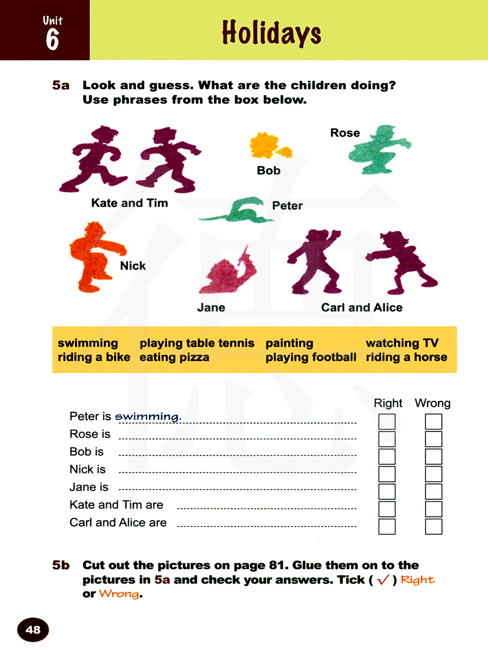 剪掉81页的图片。把它们贴到5a的图片上,然后检查你的答案。勾一勾Right或者Wrong.