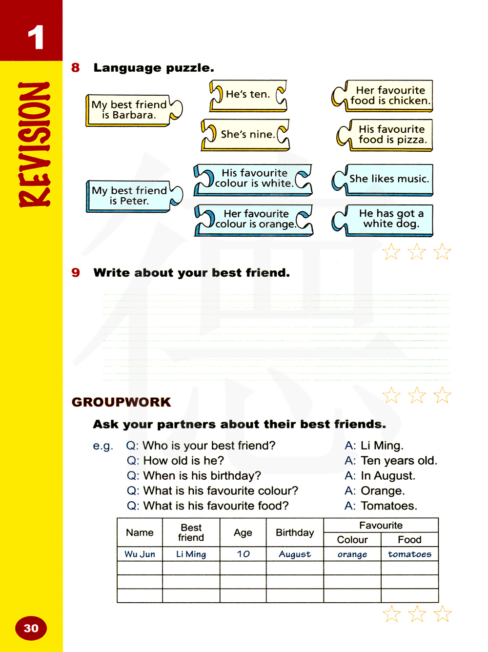 名字 吴军 最好的朋友 李明 年龄 十岁 生日 八月 最喜欢的 颜色 橙色 食物 西红柿