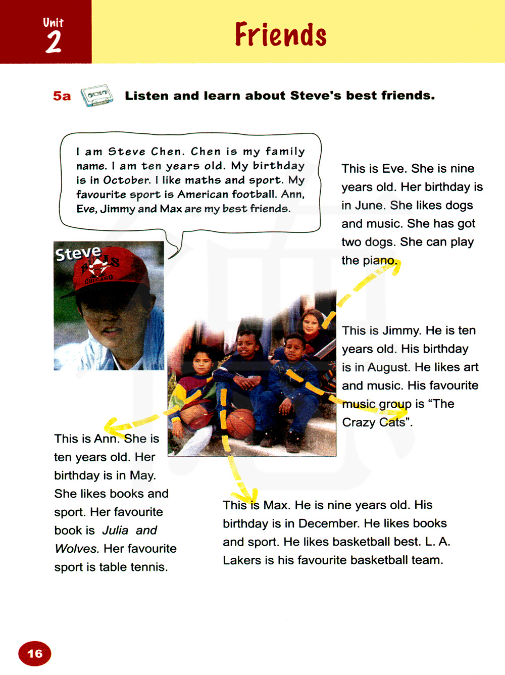 我是史蒂夫·陈。陈是我的姓。我十岁。我的生日是在十月。我喜欢数学和运动。我最喜欢的运动是橄榄球。安,伊夫,杰米和马克斯是我最好的朋友。