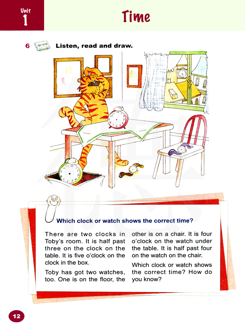 托比的房间里有两个时钟。桌上的那个时钟显示的是三点半。盒子里的那个时钟显示的是五点钟。