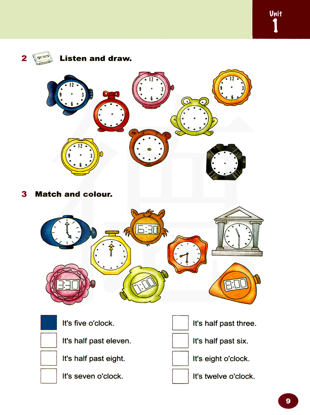把相对应的时间搭配起来并在前面的方框中涂上对应的颜色。