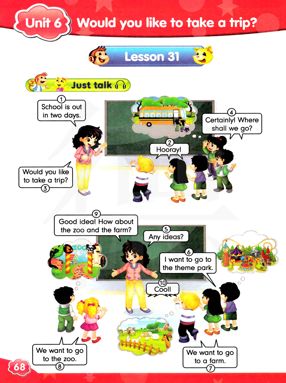 ----Good idea! How about the zoo and the farm? 好主意!去动物园和农场怎么样? ----Cool! 太酷了!