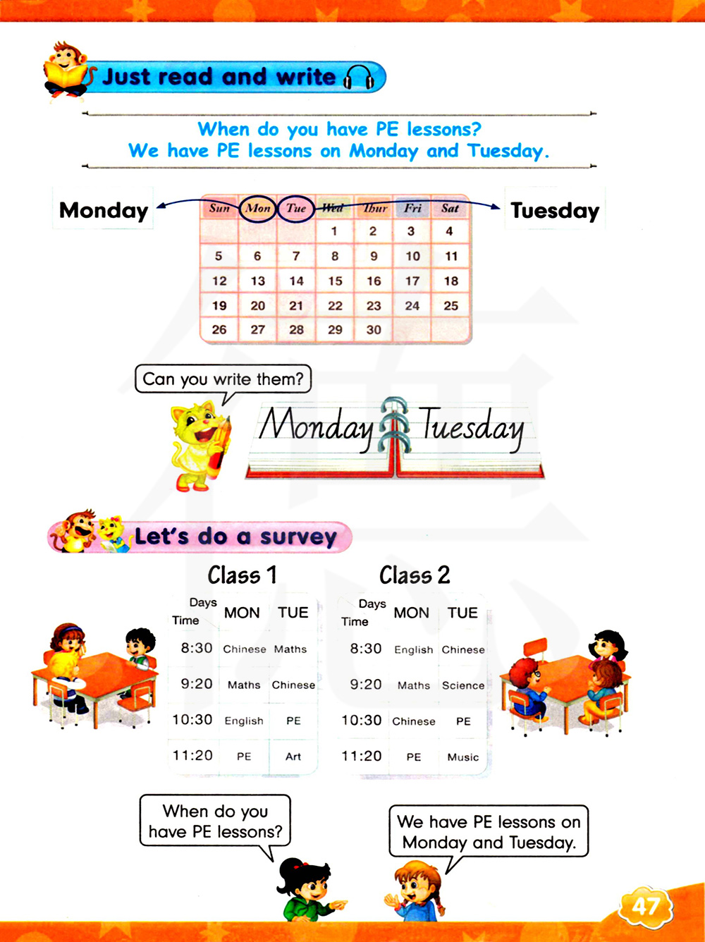 我们星期一和星期二有体育课。