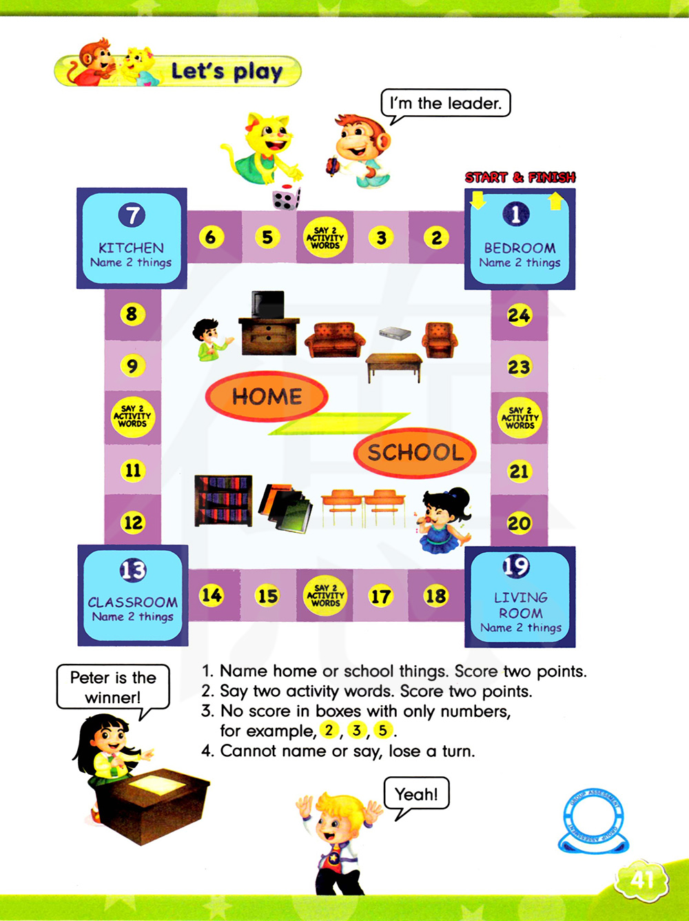 1.说出家或学校的东西。得两分。 2. 说出两项活动的单词。得两分。 3.只有数字的盒子里是没有分的,例如,2,3,5. 4.不能说出来的,失去一次机会。