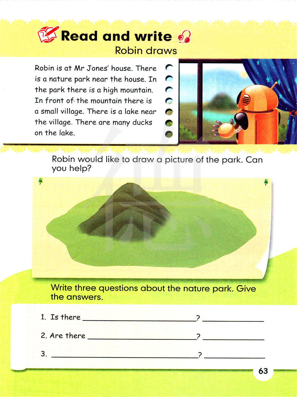 罗宾在琼斯先生的房子里,房子附近有一个自然公园,公园里有一座高山,山的前面有一个小村庄。村庄附近有一个湖。湖里面有很多的鸭子。