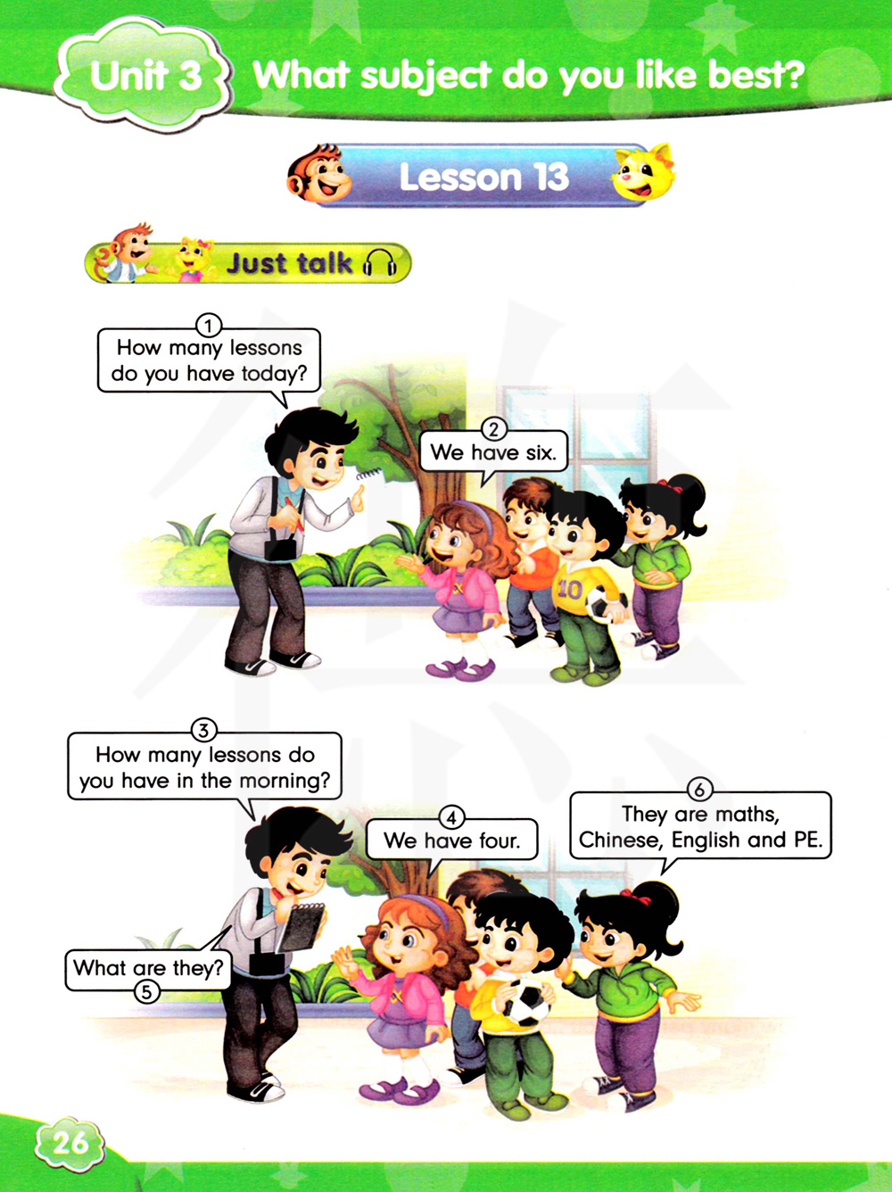 2. How many lessons do you have in the morning?你们早上有几节课? ----We have four. 我们有四节。 ----What are they?他们是什么?