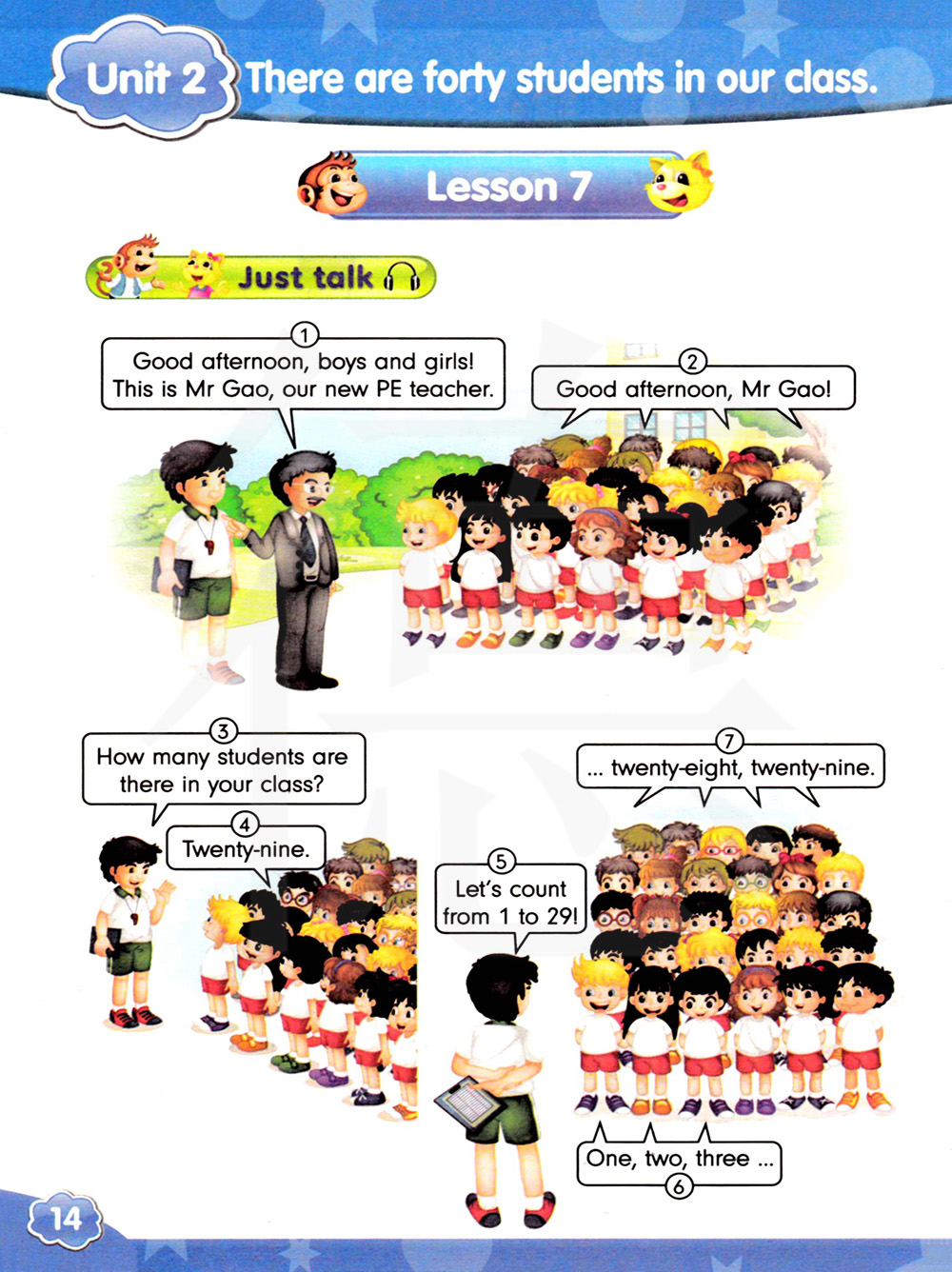 1. How many students are there in your class? 你们班有多少学生? ----There are forty. 有四十人。