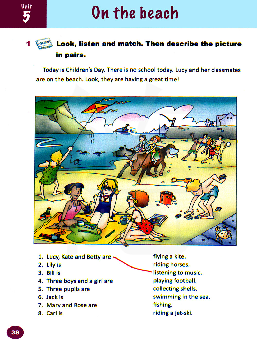 看一看,听一听并连一连。然后两个人一组描述图片。
