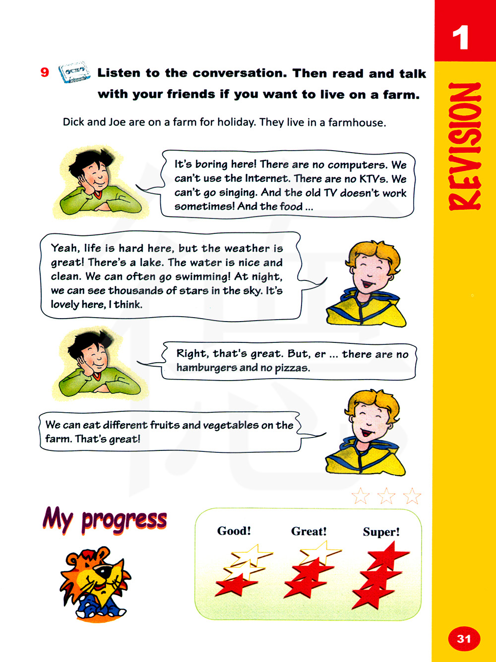 听对话。然后读一读并和你的朋友谈谈你是否想住在农场。