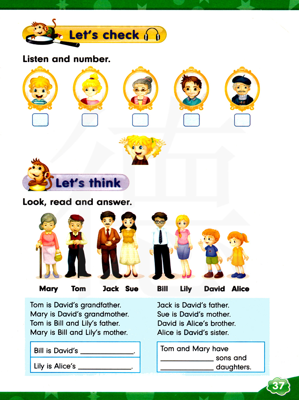汤姆是大卫的祖父。 玛丽是大卫的祖母。 汤姆是比尔和莉莉的爸爸。 玛丽是比尔和莉莉的妈妈。