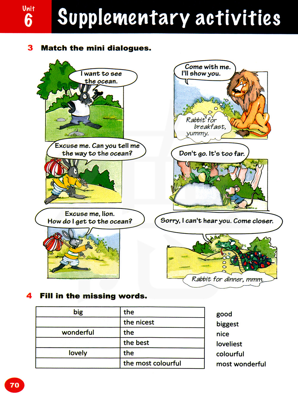 狮子,打扰一下。我该怎么去大海呢?跟我来。我告诉你怎么去。 兔肉早餐,美味!