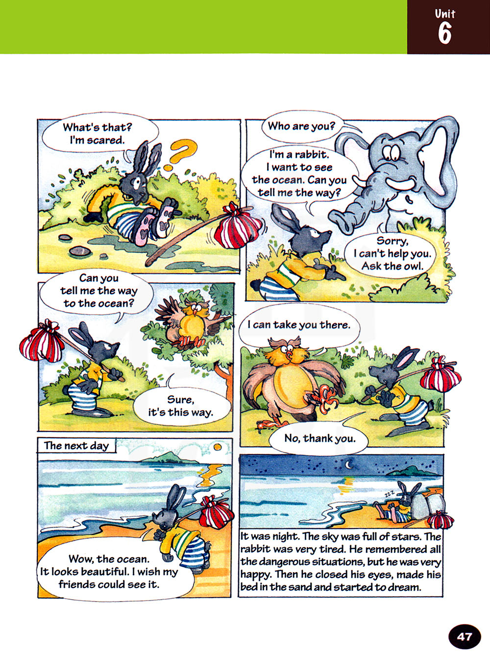 夜幕降临。天空中繁星密布。兔子累坏了。他想起了所有危险的处境,但他很开行。然后闭上眼睛,躺在沙滩上开始进入梦乡。