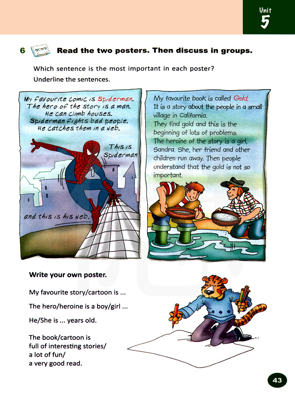 我最喜欢的漫画是《蜘蛛侠》。这个故事的英雄是一个人类。他能攀爬房屋。蜘蛛侠与坏人战斗。他用一张网抓住他们。这是蜘蛛侠,这是他的网。