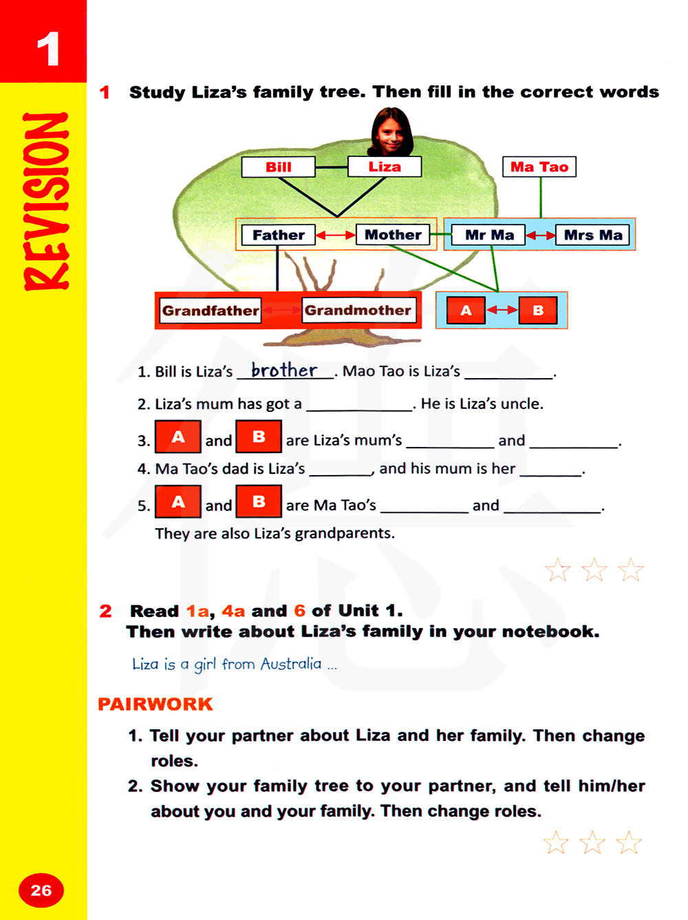 阅读第一单元的1a,4a和第6部分。然后在你的笔记本上写一写关于莉莎一家的事情。