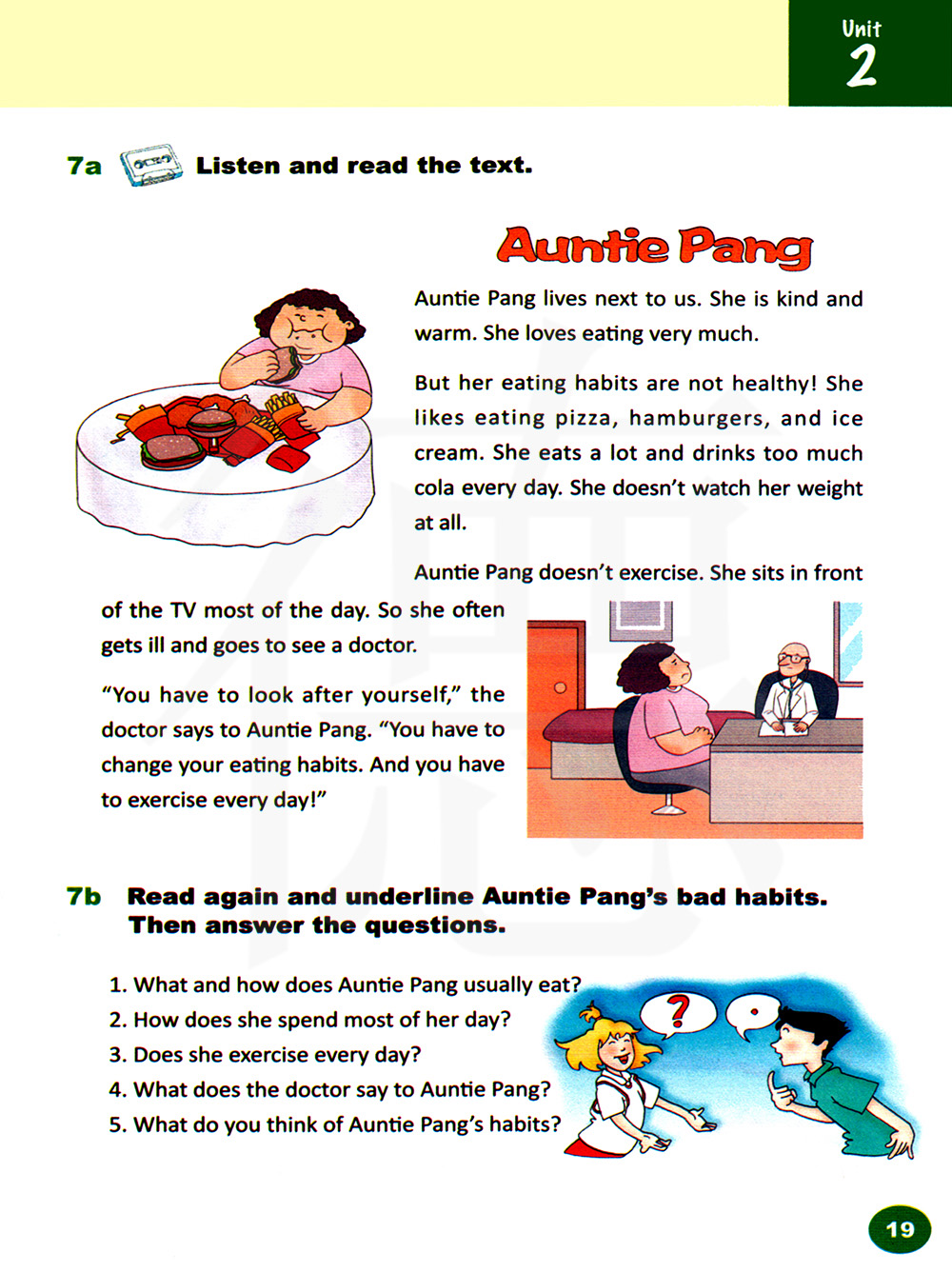 1.庞阿姨通常吃什么?怎样吃? 2.她一天中的大部分时间怎么度过? 3.她每天做运动吗? 4.医生对庞阿姨说了什么? 5.你觉得庞阿姨的习惯如何?