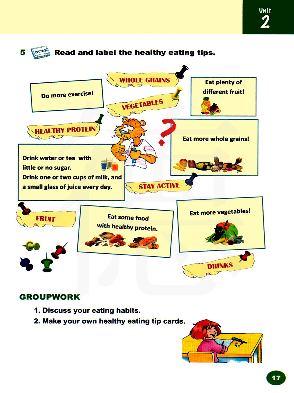 讨论你们的饮食习惯。 制作你们自已的饮食小贴士卡片。