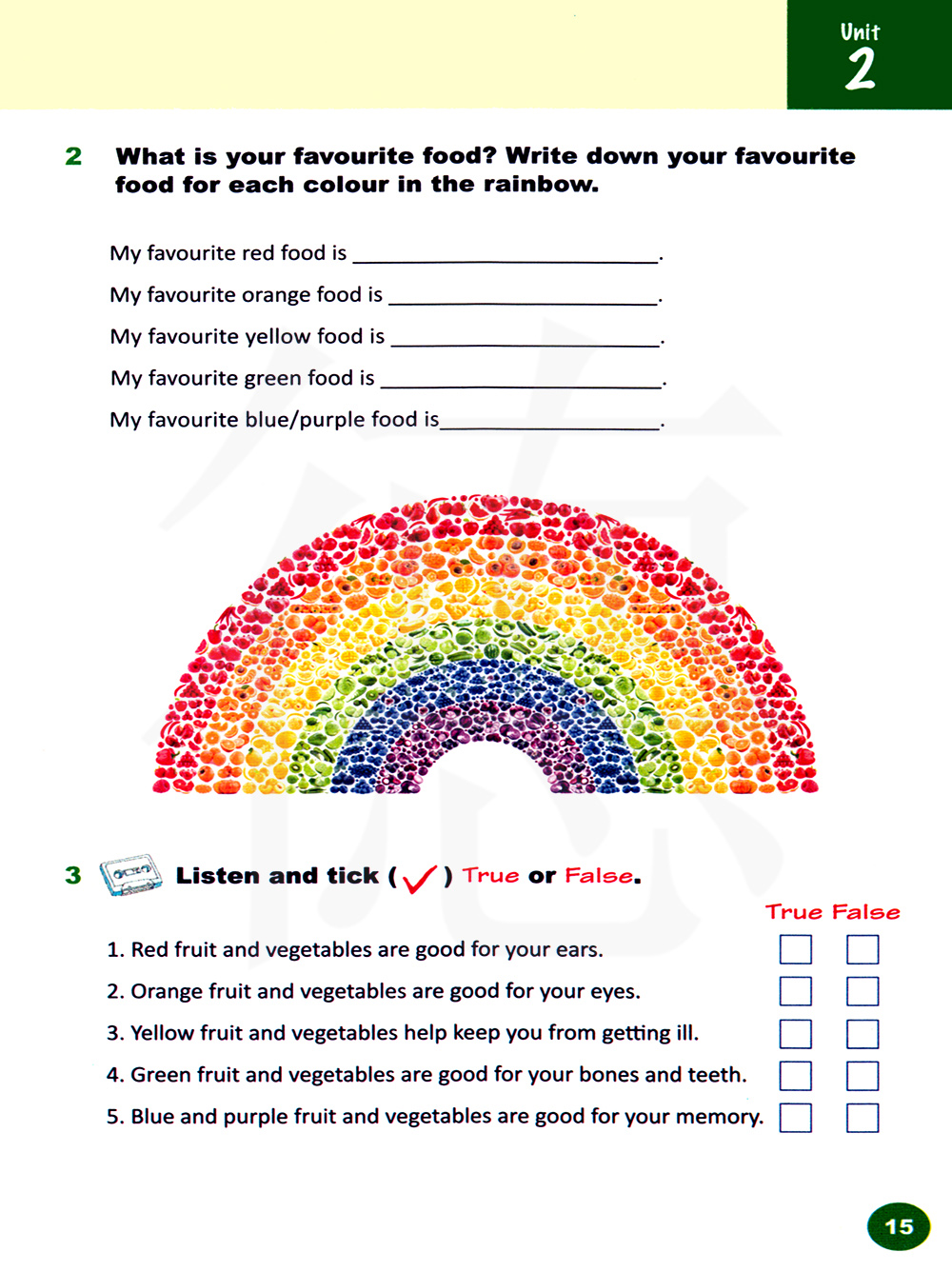 下面的彩虹是有很多种食物组成的,每一个颜色里都有很多种食物。红色食物里我最喜欢是是苹果,那么我可以说my favourite red food is apple。每个颜色里你最喜欢哪一种食物呢?在横线上写写吧。