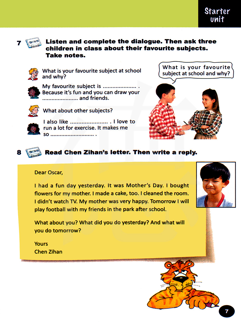 听录音并完成对话。然后问班上的三个同学关于他们最喜欢的科目。做笔记。