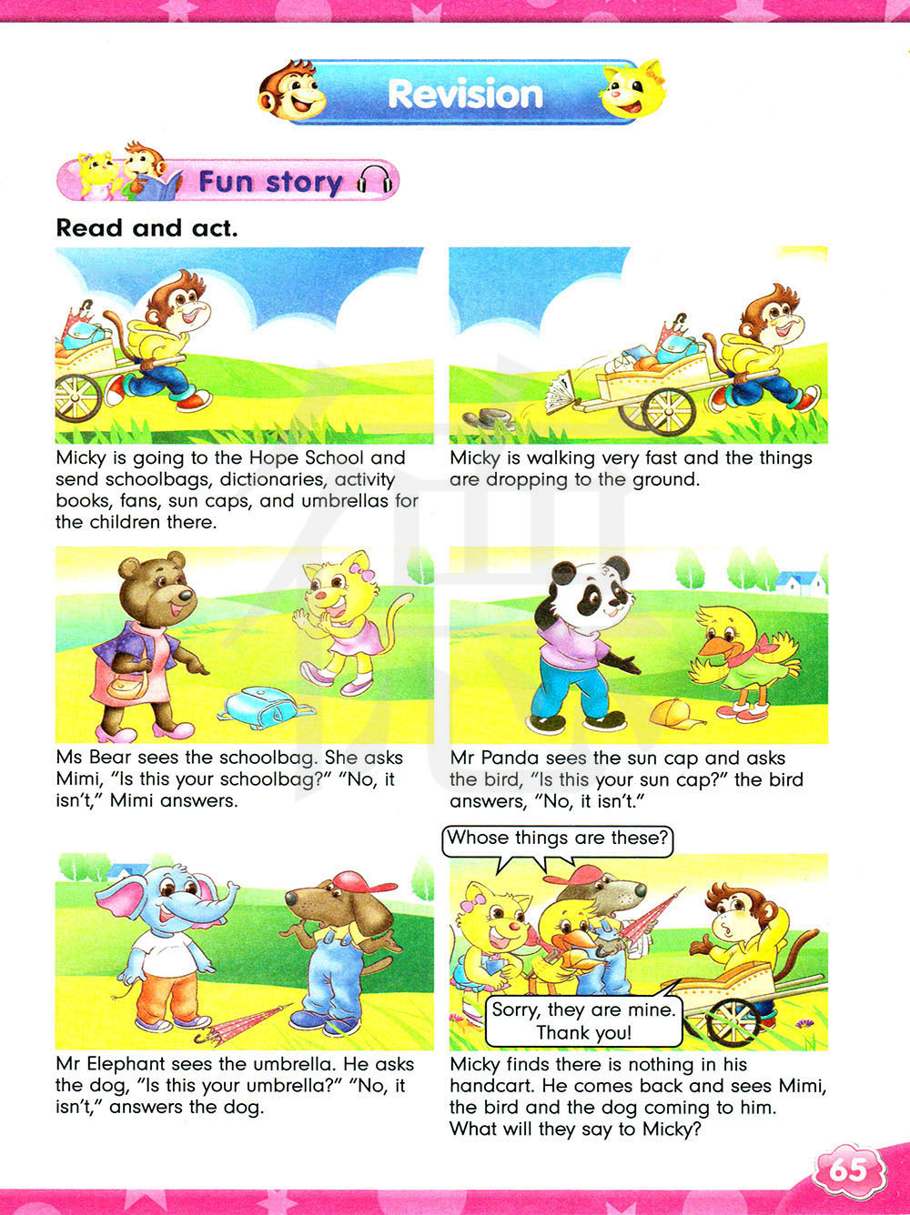 米奇发现她的手推车里什么东西都没有了。他往回走并看见咪咪、鸟儿和小狗朝着他走过来。它们会和米奇说什么?
