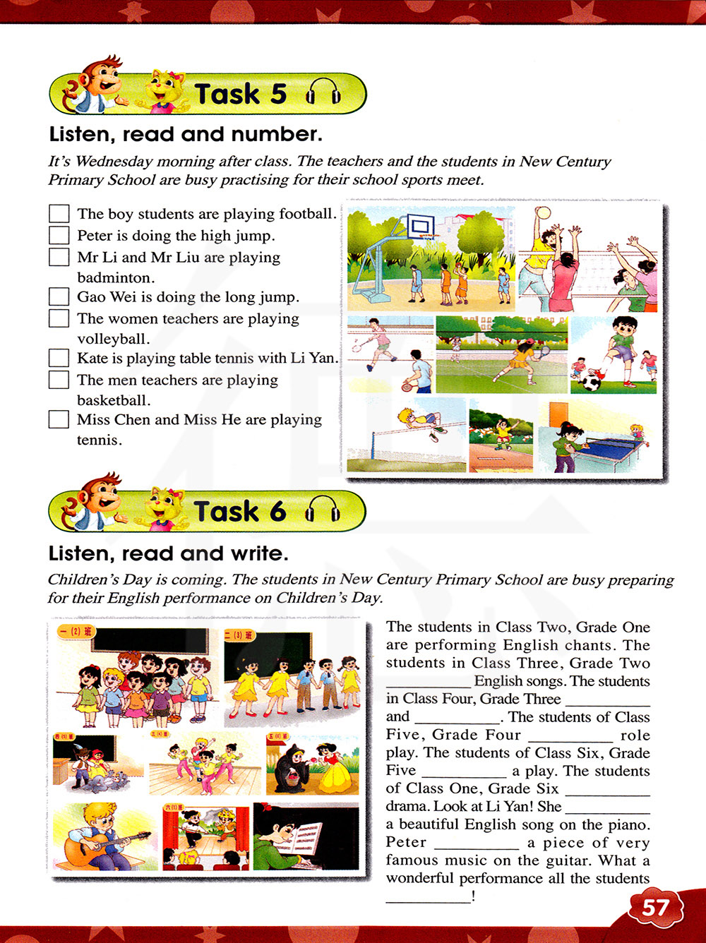 儿童节到了,新世纪小学的学生们正忙着准备他们在儿童节的英语 节目。