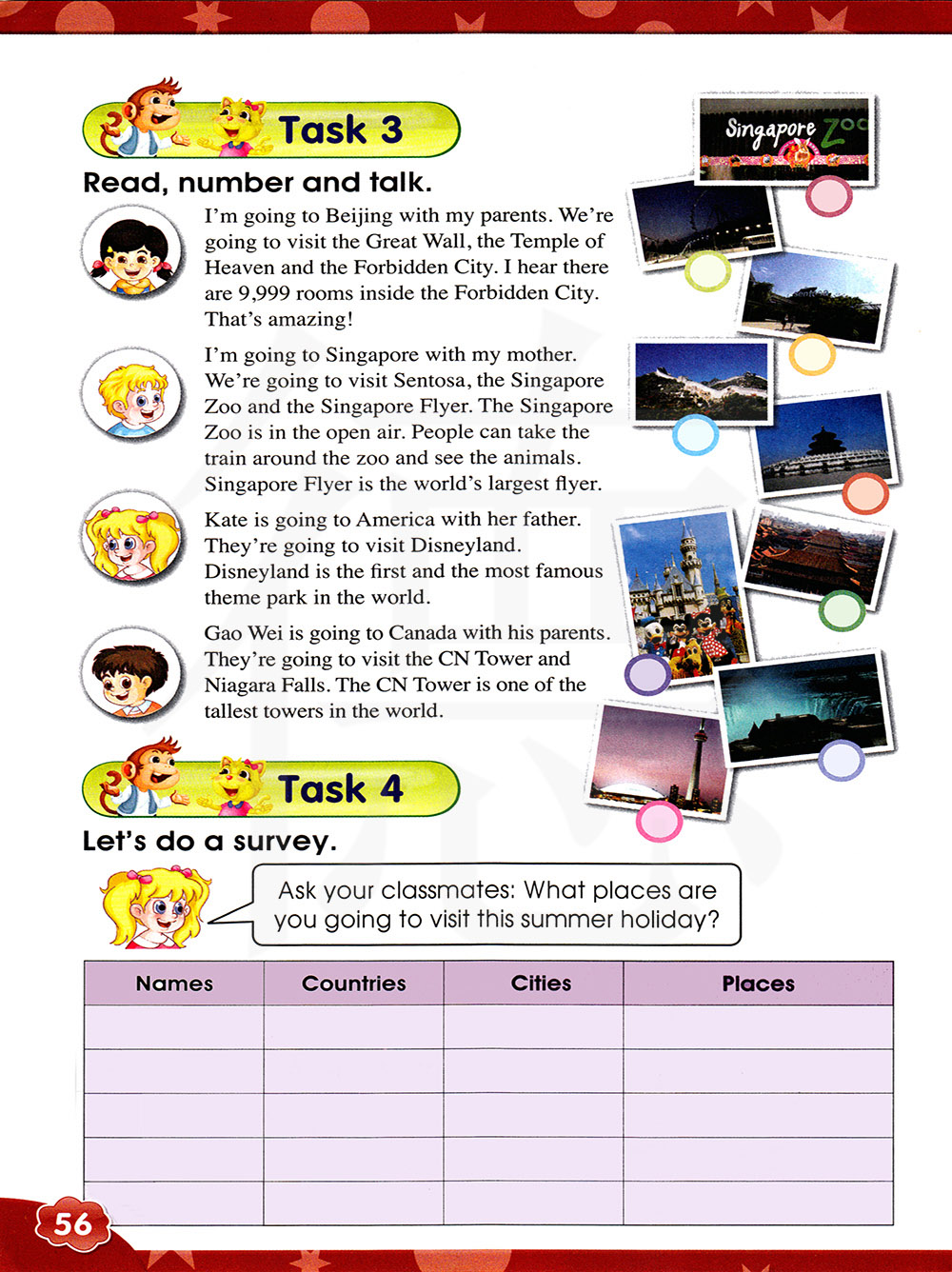 我打算跟我母亲去新加坡,我们打算去参观圣淘沙岛、新加坡动物园和新加坡 摩天轮。新加坡动物园是露天的。人们可以乘坐列车环游动物园和看动物。新 加坡摩天轮是世界上最大的摩天轮。