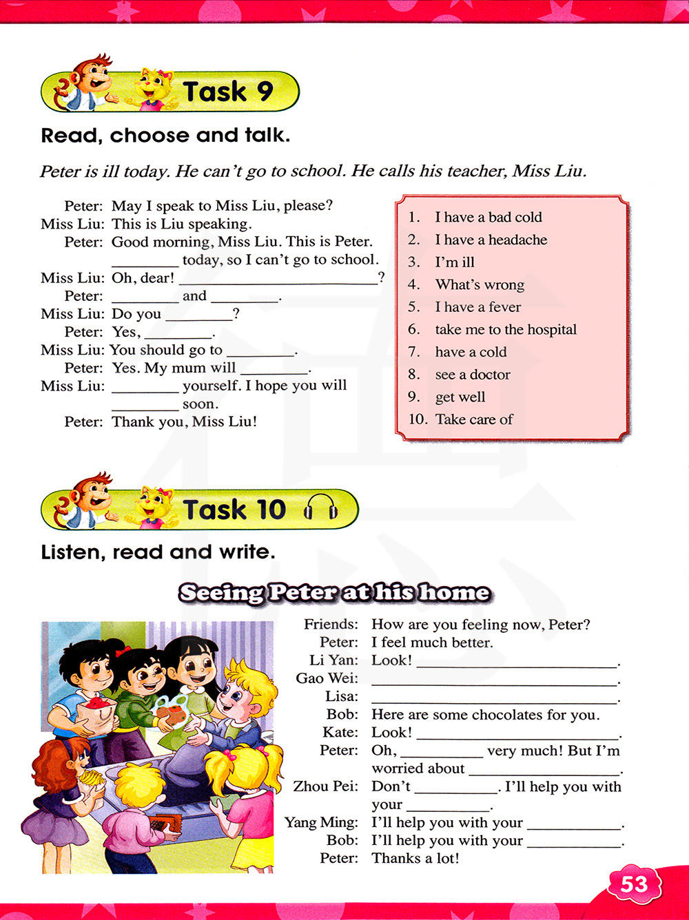 彼得今天生病了,他无法去上学,他打电话给他的老师刘老师。