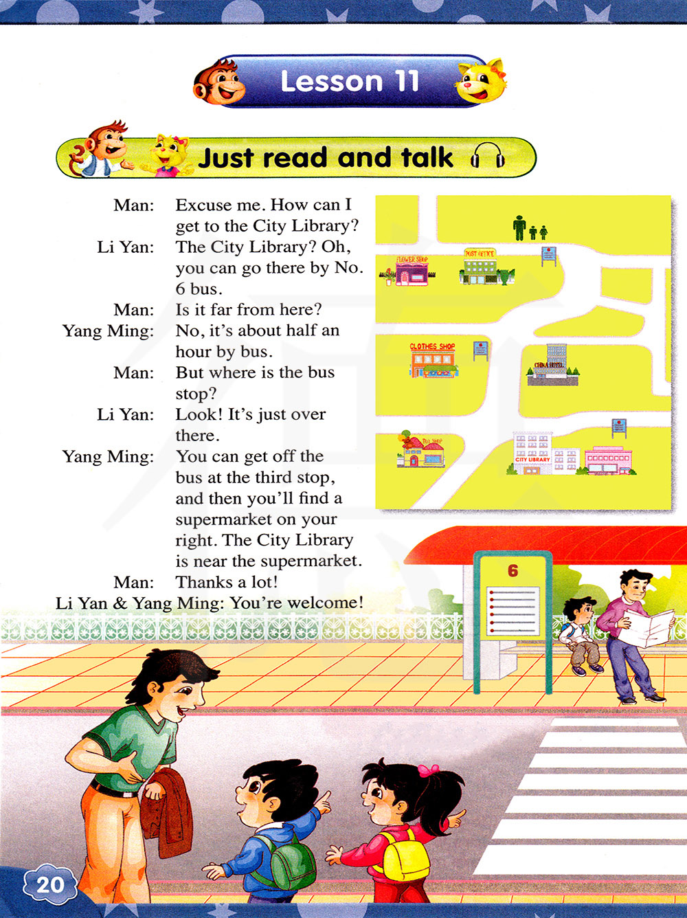 你可以在第三站下公共汽车,然后你会发现一个超市在你右边, 城市图书馆就在超市附近。 太谢谢了! 不用客气!