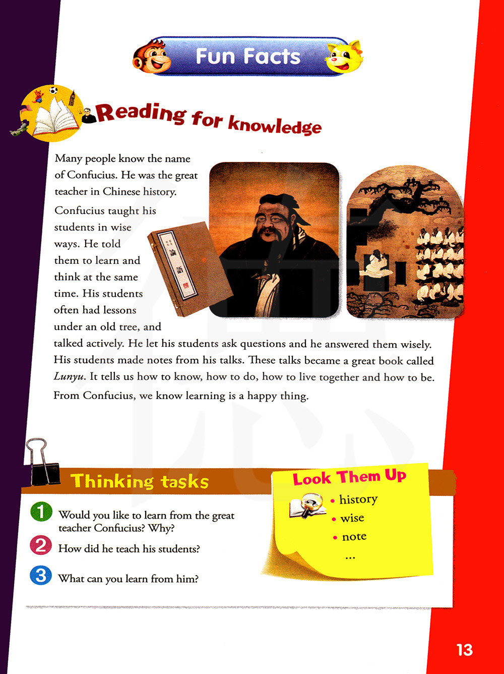 很多人知道孔子的名字,他是中国历史上伟大的老师。孔子用明智的方式 教导他的学生,他告诉他们学而不思则罔,思而不学则殆。...他的学生经常 在一棵老树下上课,积极发言。他让他的学生提问,并明智的回答他们,他的学生对他的讲话做了笔记,。 这些讲话成了一部名为【论语】的著作。它教我们如何学习,如何做事,如何一起生活以及成为一个怎样的人。