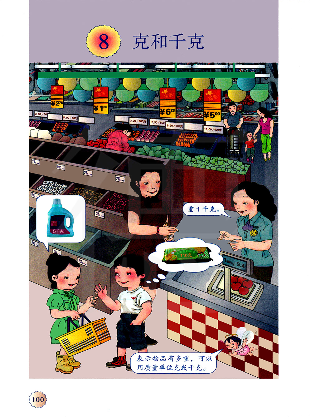 克和千克是国际上通用的质量单位。计量较轻的物品的质量时,通常用“克”;计量较重的物品质量时,通常用“千克”作单位。