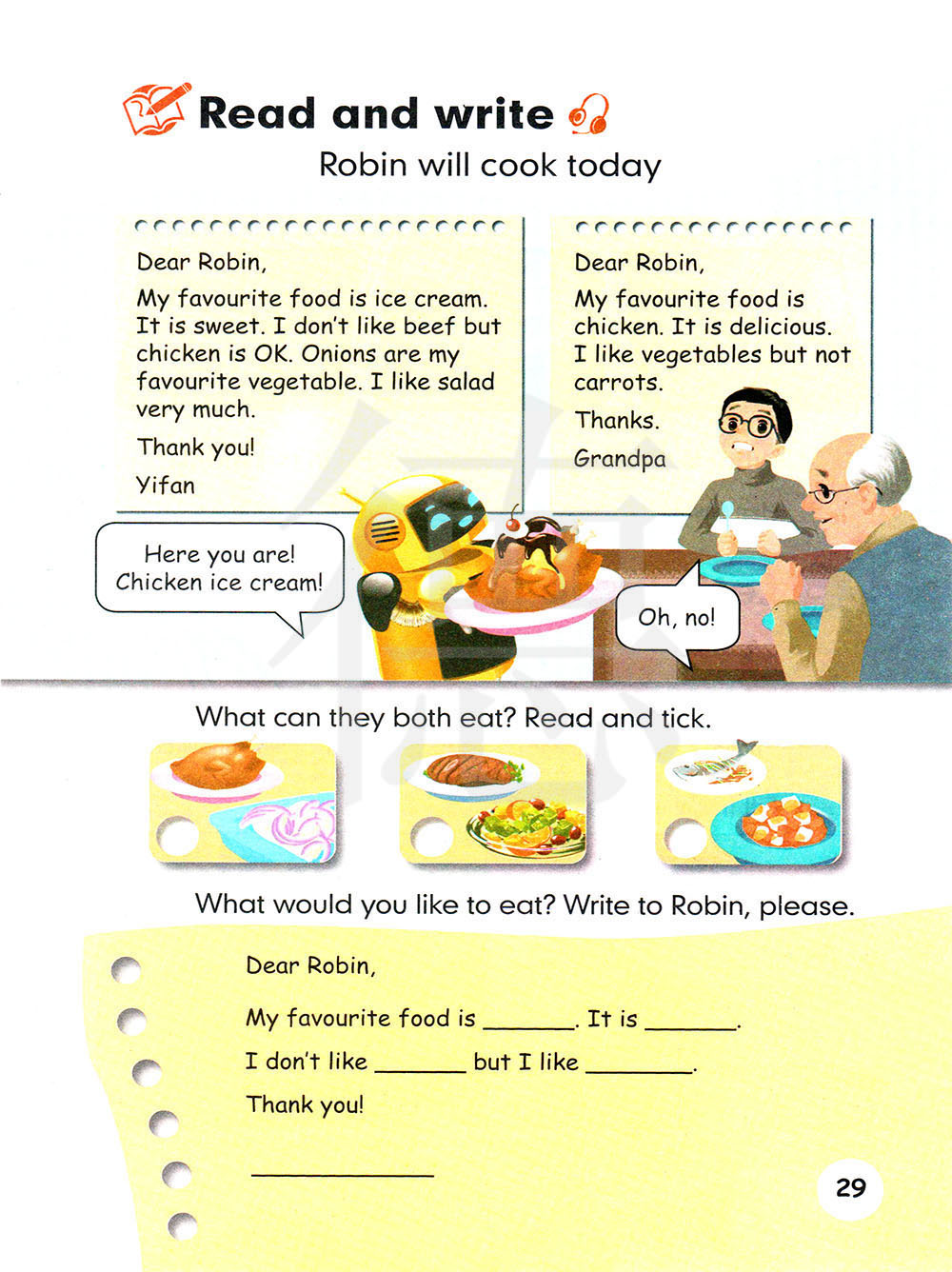 我最喜欢的食物是冰激凌。它很甜,我不喜欢吃牛肉,但是鸡肉可以。洋葱是最喜欢的蔬菜,我非常喜欢吃沙拉。