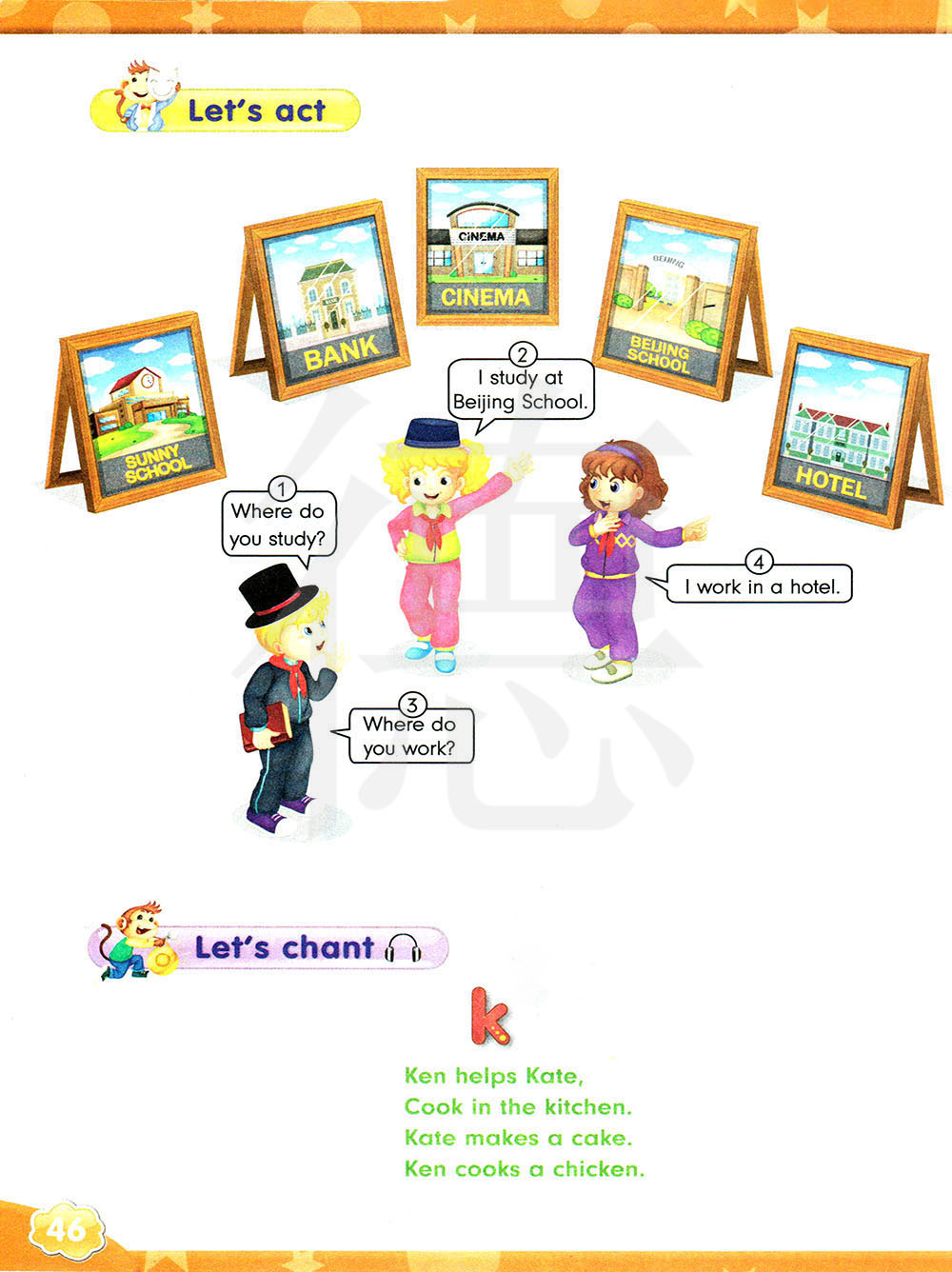 肯帮助凯特,在厨房里烹饪。凯特做蛋糕。肯烹煮鸡肉。