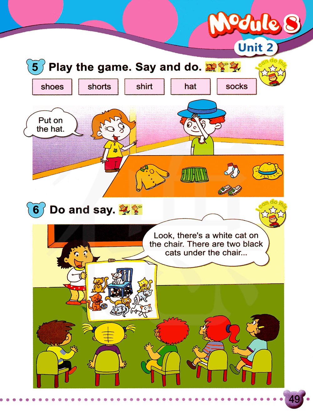 看,椅子上有一只白色的猫。椅子下面有两只黑色的猫....