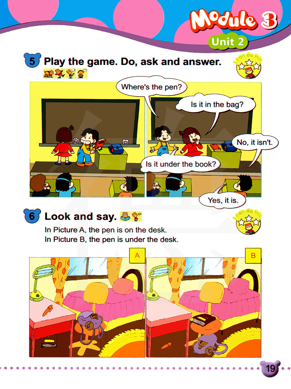 A图中,钢笔在书桌上。 B图中,钢笔在书桌下面。