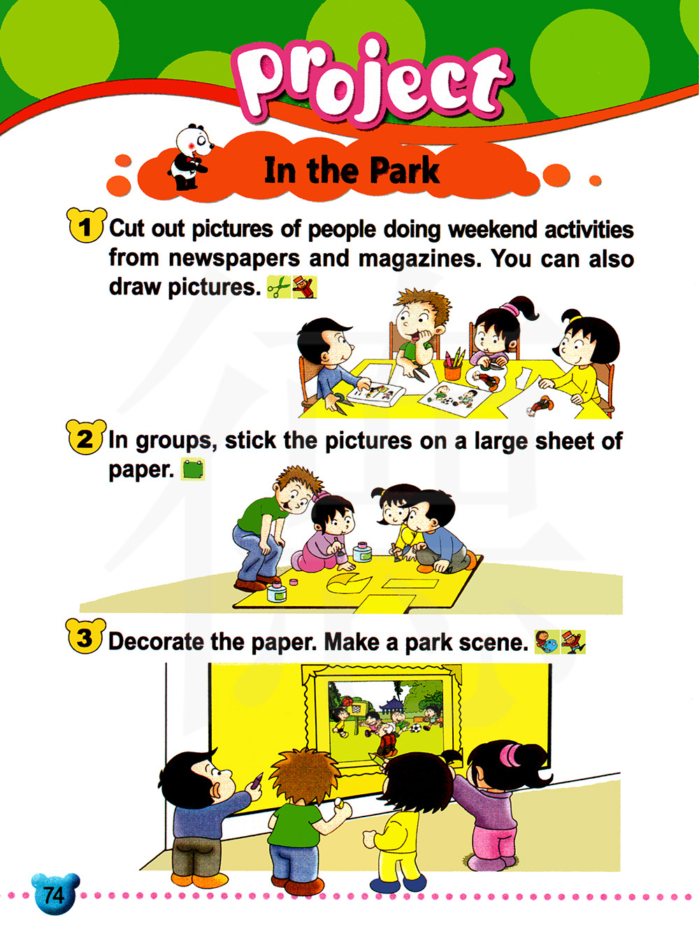 从报纸和杂志上剪一些人们做周末活动的照片。你可以画画。