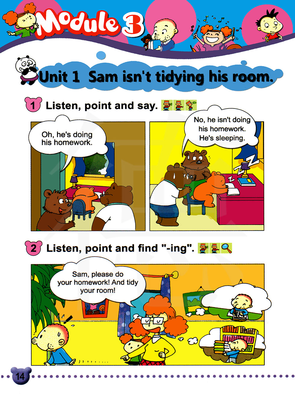 ①tidy 整理 ,收抬 ;②room 房间 ;③do 做,干 ;④ homework 家庭作业 ;⑤ sleep 睡觉 ;