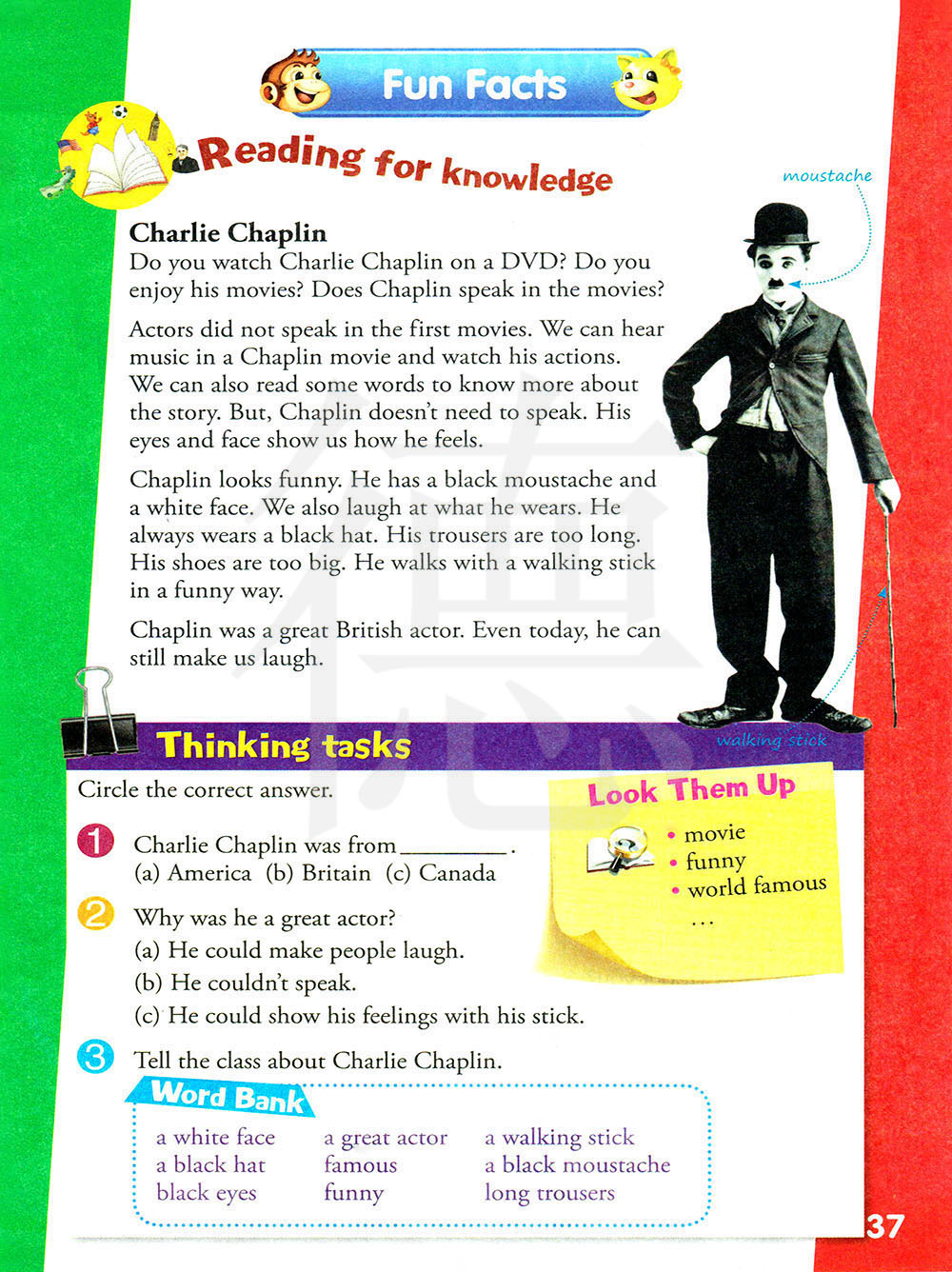 卓别林看起来很滑稽。他有黑色的胡子和白皙的脸。我们还取笑他的衣着。他总是戴着一顶黑色帽子。他的裤子太长了。 他的鞋子太大了。他拄着手杖以奇怪的姿势走路。