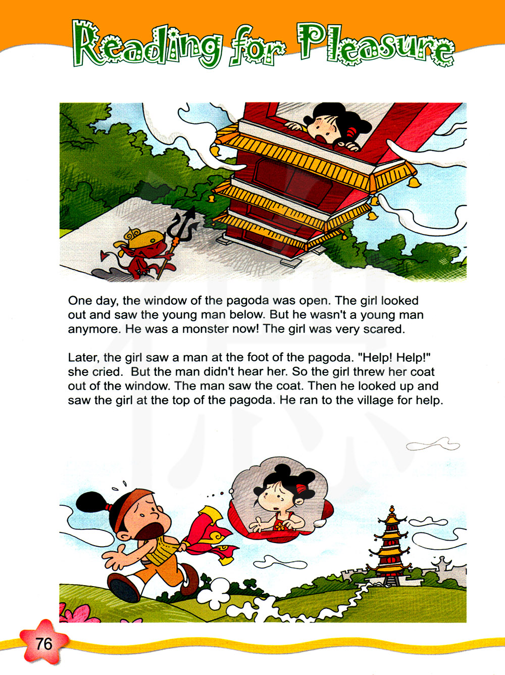随后,女孩看到有一个人在踏脚“救命!救命!”她大声叫喊。但是那个人没有听到她的呼喊。 所以女孩把她的外套扔出了窗户,那个人看到了外套,然后他往上看,看到了在塔顶的女孩。 他跑向村庄寻求帮助。