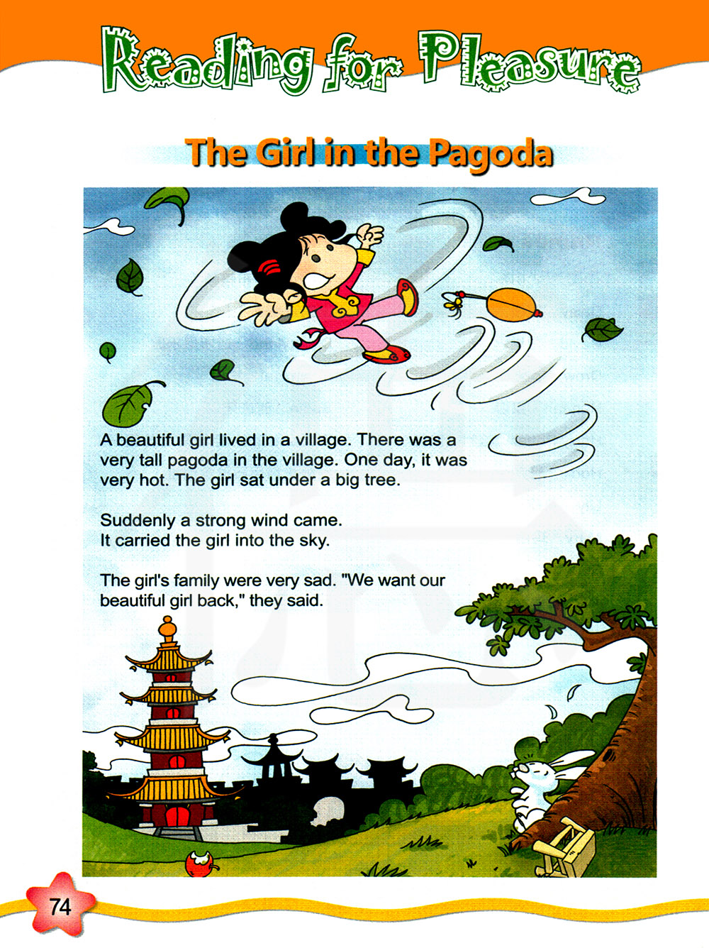 一个漂亮的女孩住在一个村庄里,村庄里有一座非常高的塔,一天,天气非常炎热, 那个女孩坐在一棵大树下。