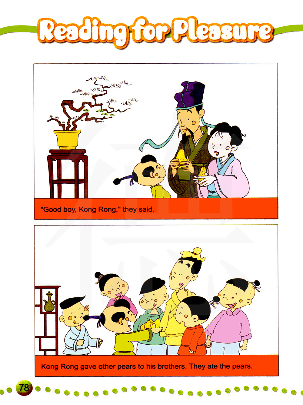 孔融把其他梨分给他的兄弟。他们吃着梨。