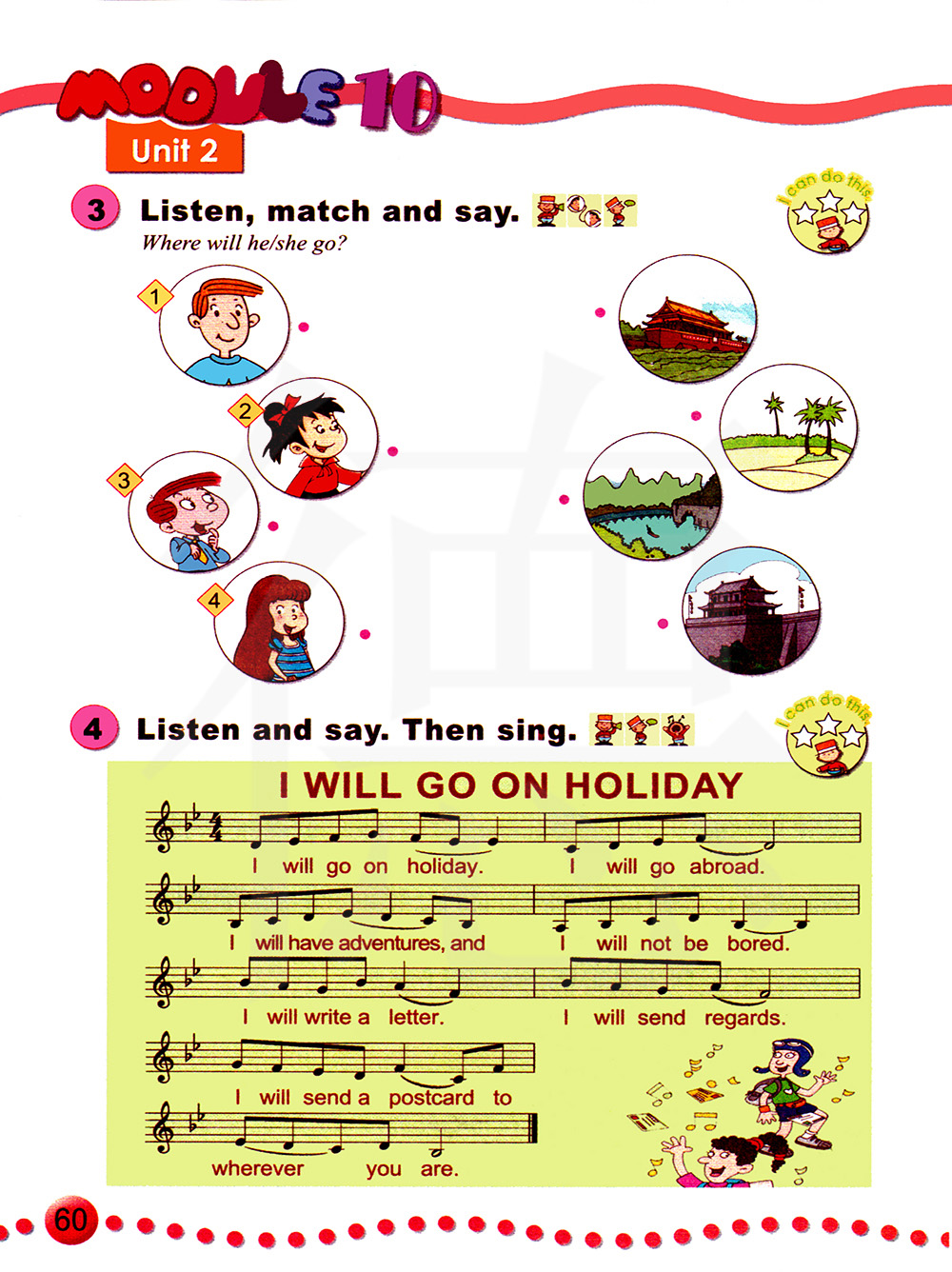 我将要去度假。我将要出国。我将去探险,我不会感到无聊。我将写一封信。我将要寄去问候。无论你在哪里,我将给你寄一张明信片。