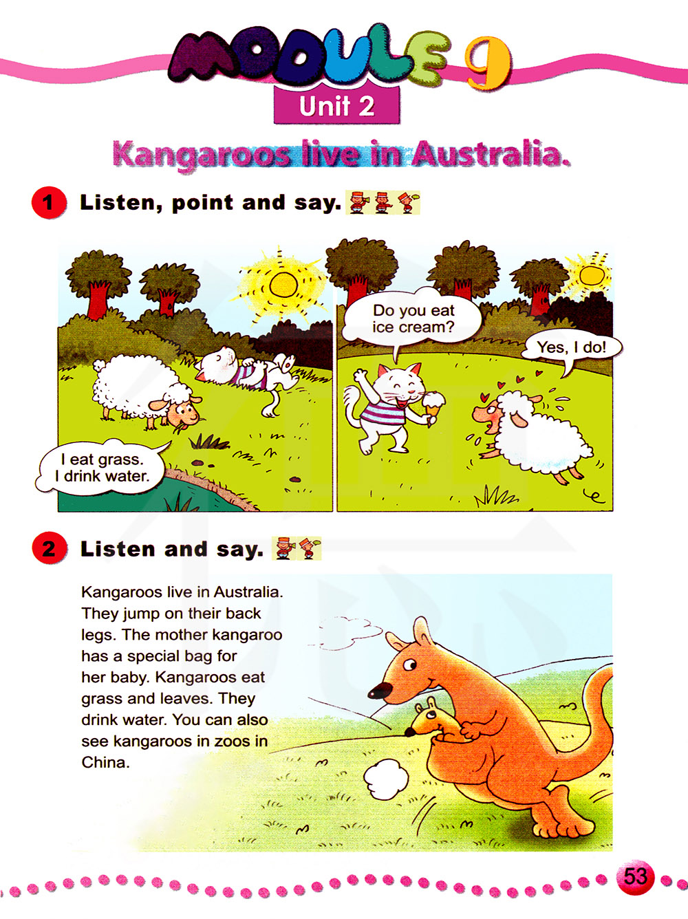 袋鼠生活在澳大利亚。它们用后退跳跃。袋鼠妈妈有一个特殊的袋子装她的宝宝。袋鼠吃草和叶子。它们喝水。你也可以在中国的动物园里看到袋鼠。