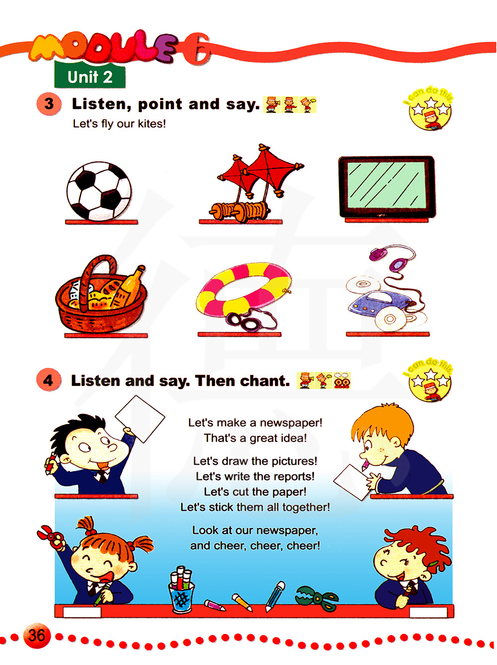 我们做一张报纸吧!这是个好主意!我们画画吧!我们写报告吧!我们剪纸吧!我们把全部粘贴在一起吧!看着我们的报纸欢呼、欢呼、欢呼!