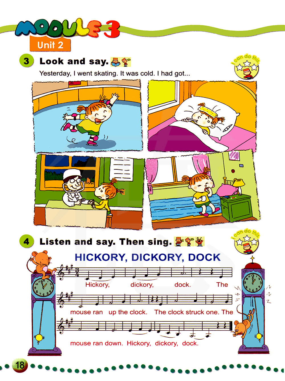 滴答滴答钟。老鼠跑到钟表上。钟敲了一次。老鼠跑了下来。滴答滴答钟。