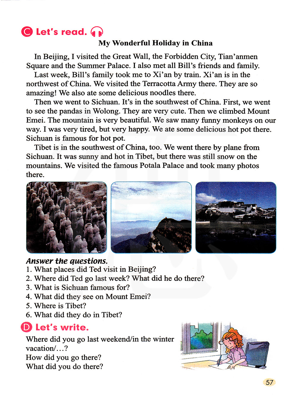 然后我们去了四川。 它在中国的西南部。 我们先去卧龙看了熊猫。 它们很可爱。 接着我们爬峨眉山。 那座山很美丽。 我们在路上看到很多有趣的猴子。 我很累,但是很开心。 我们在那儿吃了美味的火锅。 四川因火锅而出名。 西藏也在中国的西南部。 我们从四川乘飞机去那儿。 在西藏,天气晴朗而且很热, 但是在高山上仍然有雪。 我们参观了著名的布达拉宫, 并在那儿拍了很多照片。